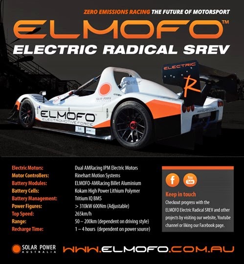 An electric race car team in Australia just became the first team to race an electric car against gas powered race cars on equal terms. The team, ELMOFO (electro motive force), builds high end electric cars, and has built a race car based on a Radical SR8 chassis. With that car they entered the 2014 NSW Motor Race Championship at Sydney Motorsport Park, last weekend. While a battery pack problem prevented completing the weekend the team reportedly made a great showing.